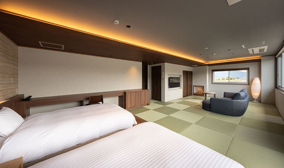シングルベッドが2台付いた洋室と畳スペースを備える和洋室です。お荷物が多い方でも広々とご利用いただけます。